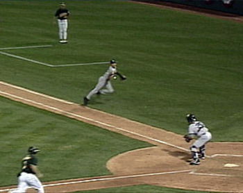 Why? Because I was watching in 2001, when the A’s were up 2-0 on the Yanks, coming back to the Coliseum, and then Barry Zito threw one bad pitch to Jorge Posada and Jeremy Giambi’s fat ass didn’t slide when Derek Jeter made that fucking play that I’ve had to watch replayed a million times since then, and the A’s lost Game 3; and then Jermaine Dye broke his leg in gruesome fashion in Game 4; and the A’s went back to Yankee Stadium and Eric Chavez let a groundball go through his legs and the A’s lost in 5 again.