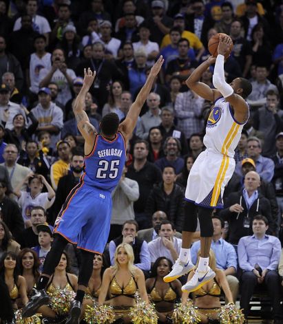 Now, back to last night’s game. My team playing in the second half of a TNT doubleheader is rough on me–the games tip-off so late that at midnight the first half was just ending–but I sacrificed sleep to catch this one, which promised to be a matchup of two high-flying, exciting young teams. OKC came out on fire, with Kevin Durant and especially Russell Westbrook ripping the nets, and carried a modest lead for most of the first half. The Dubs offense also seemed a bit stagnant for much of the second quarter, as when Harrison Barnes came into the game, the team repeatedly forced the ball to him in the post and then quit moving and just watched him dribble into a turnaround jumper. Still, they rallied back behind the sweet shooting of Klay Thompson to tie the game at 62 heading into halftime.