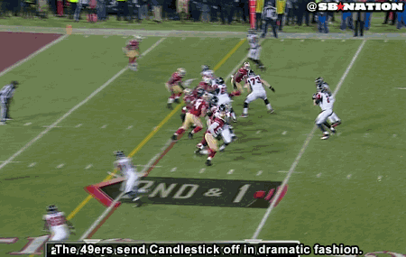 I personally wasn’t all that nostalgic about the park closing. I never went to a Niners game there, meaning that my few Candlestick memories are culled from pre-China Basin Giants games—not exactly the halcyon days of San Francisco baseball. My main concern for last night was that the Niners put their feet to the asses of the 4-10 Falcons and lockdown a playoff spot. I figured the combination of the Candlestick hype and the National TV broadcast would prevent the Niners from having a subpar look-ahead effort, and that they would summarily thrash a Falcons team that has been pretty terrible this year after barely losing to the Niners in the NFC Championship Game last season.